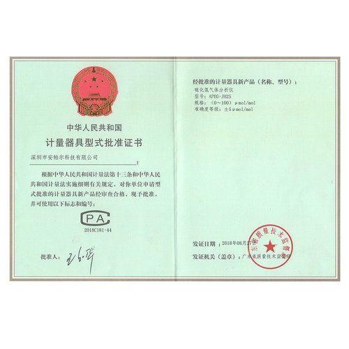 APEG-JH2S (0~100)%μmol-mol CPA計量器具形式批準證書